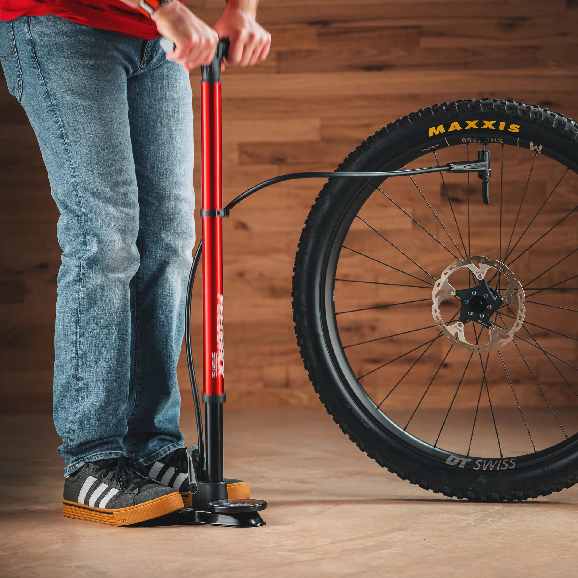 - Use as a traditional floor pump with foot lever up.